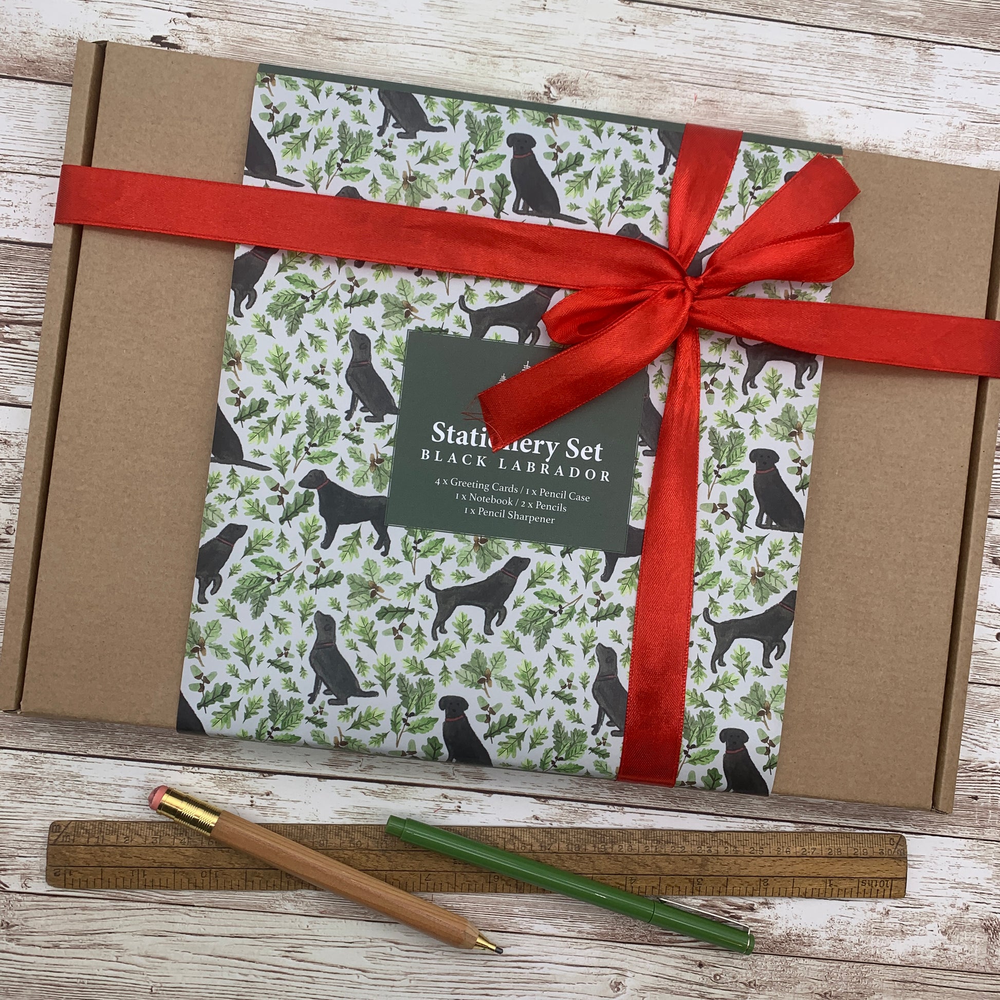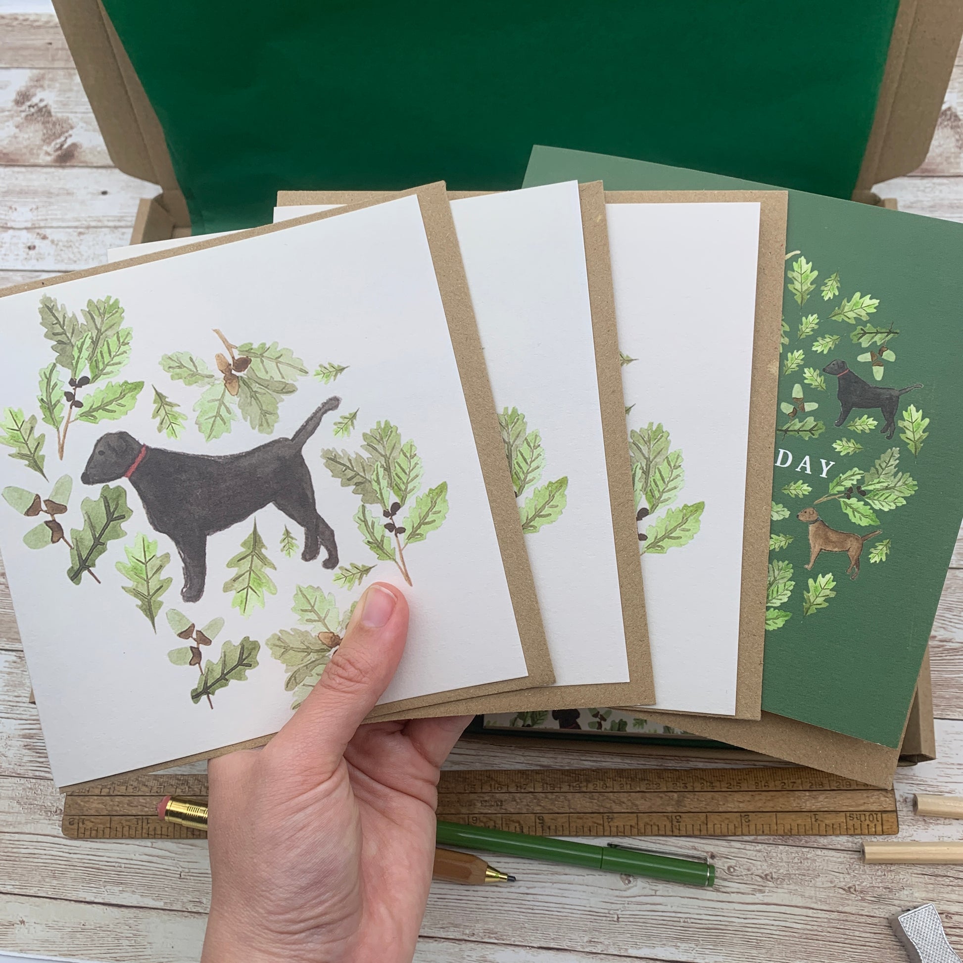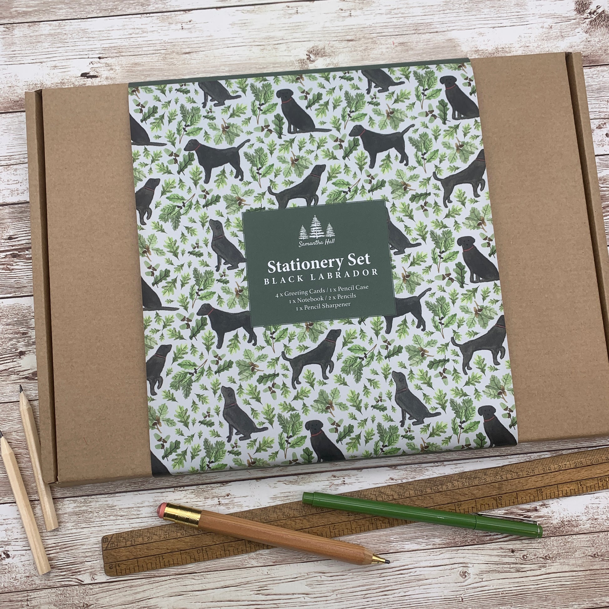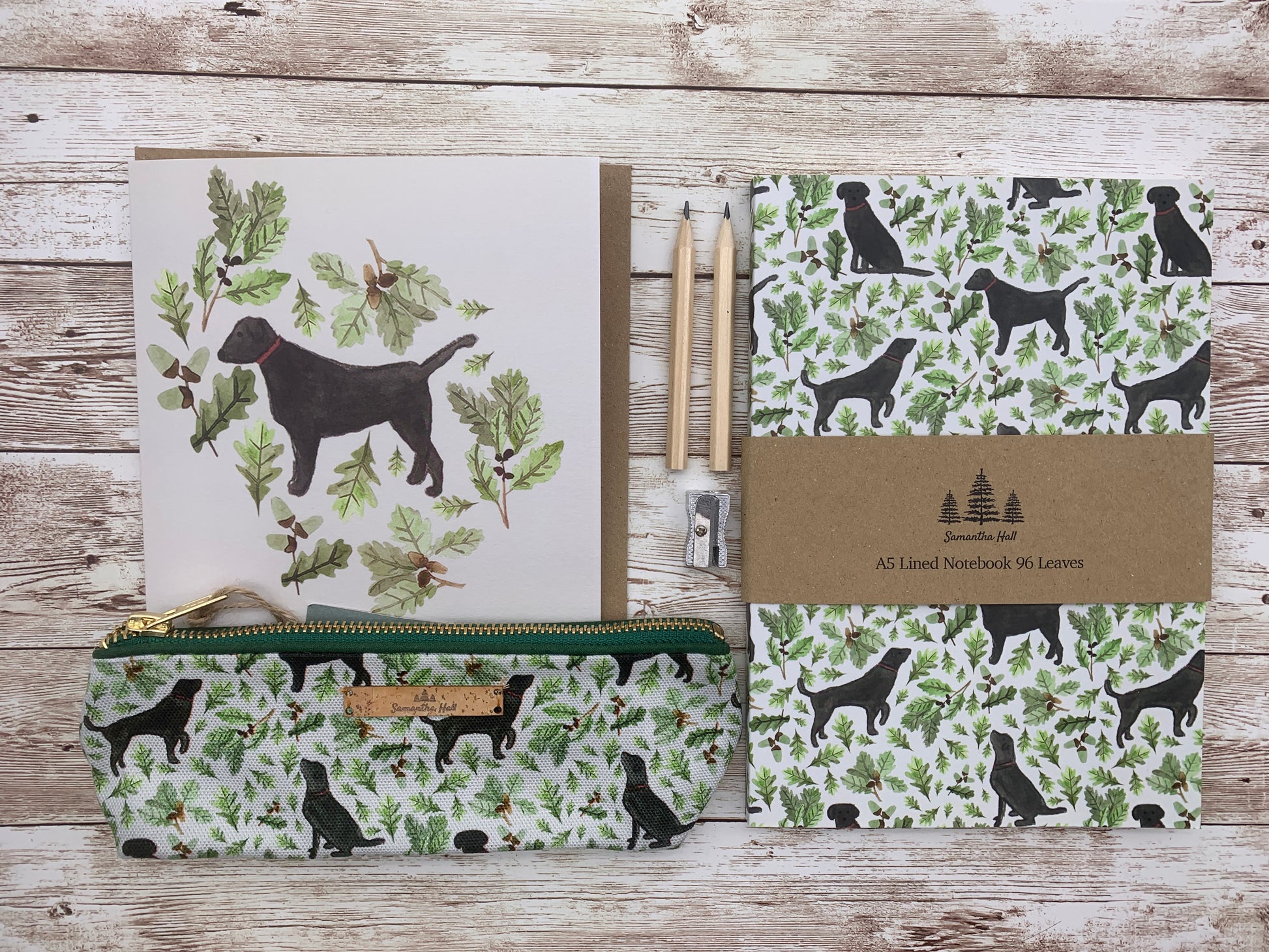 Introducing my Black Lab back to school or teacher gift set. Including a pencil case, notebook, sharpener, 2 pencils and 4 cards. Perfect for using at school, in the office or in your art studio. Great for giving to a well deserved teacher to say thank you or for back to school in September! Featuring black Labradors surrounded by oak leaves and acorns.