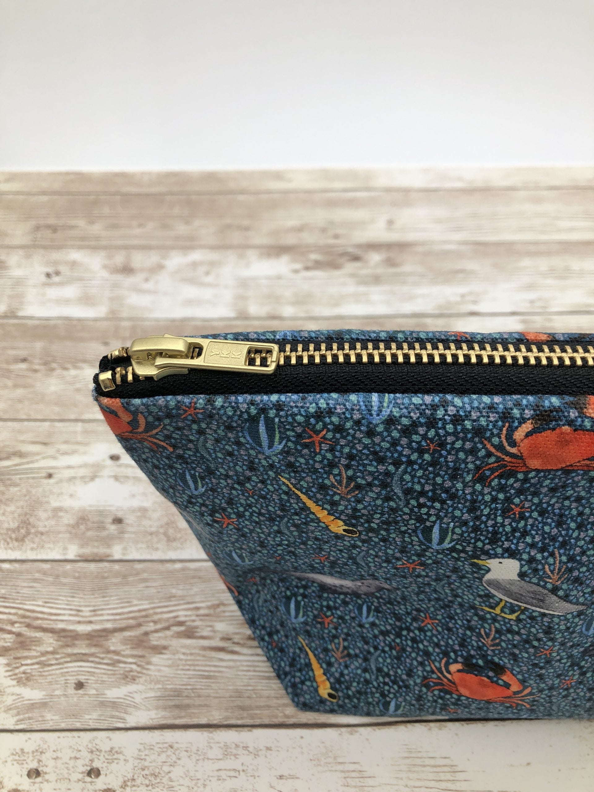 Introducing my Coastal cosmetic bag. Featuring hand painted watercolour seagulls, crabs, shells and seals surrounded by starfish, seaweed and pebbles in the sea. This collection was inspired by my love for the south coast of England and my nearby city of Brighton.