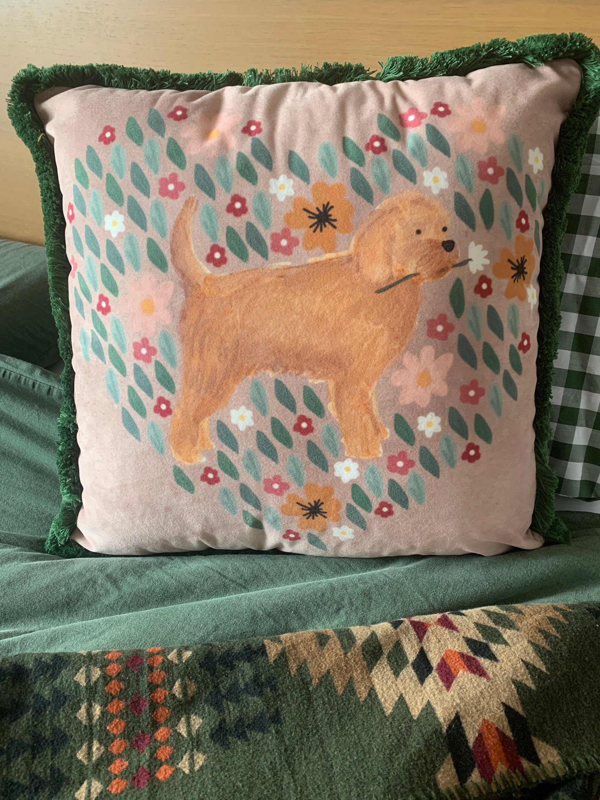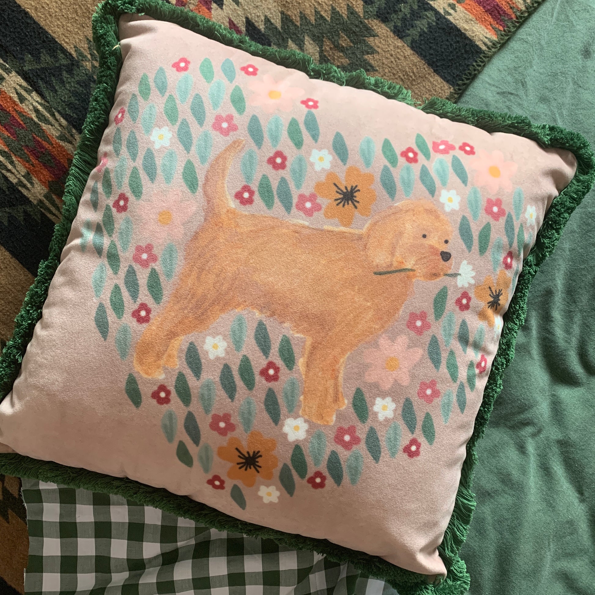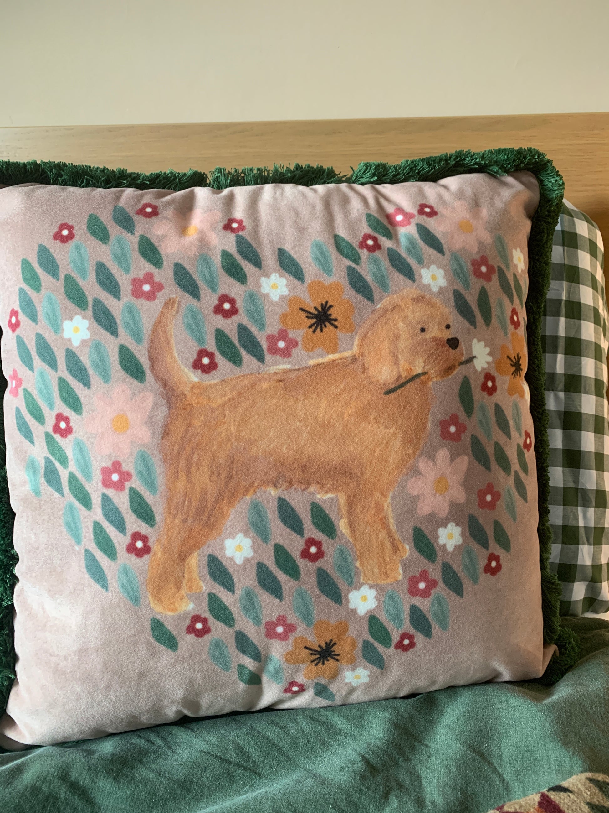 Introducing my luxurious velvet blonde cockapoo cushion. Featuring a cute Cockapoo surrounded by pink flowers and leaves on a heart shaped background . This cushion was inspired by my love for the cockapoo mix. They are just adorable! A great gift for someone who loves dogs!