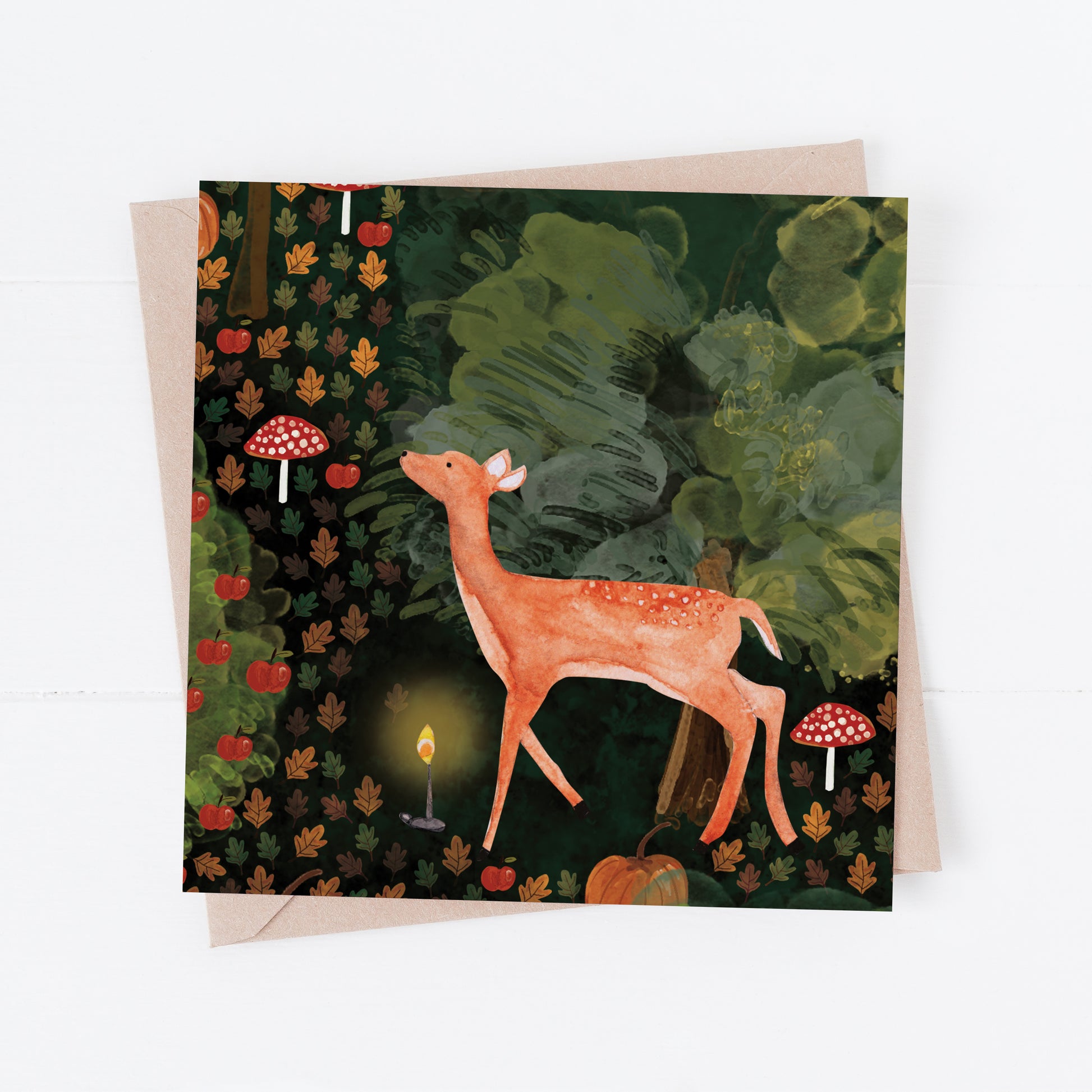 Introducing my Deer by Candlelight greeting card. Featuring a deer exploring the forest by candlelight. From my Midnight Forest collection. Perfect if you love British wildlife!