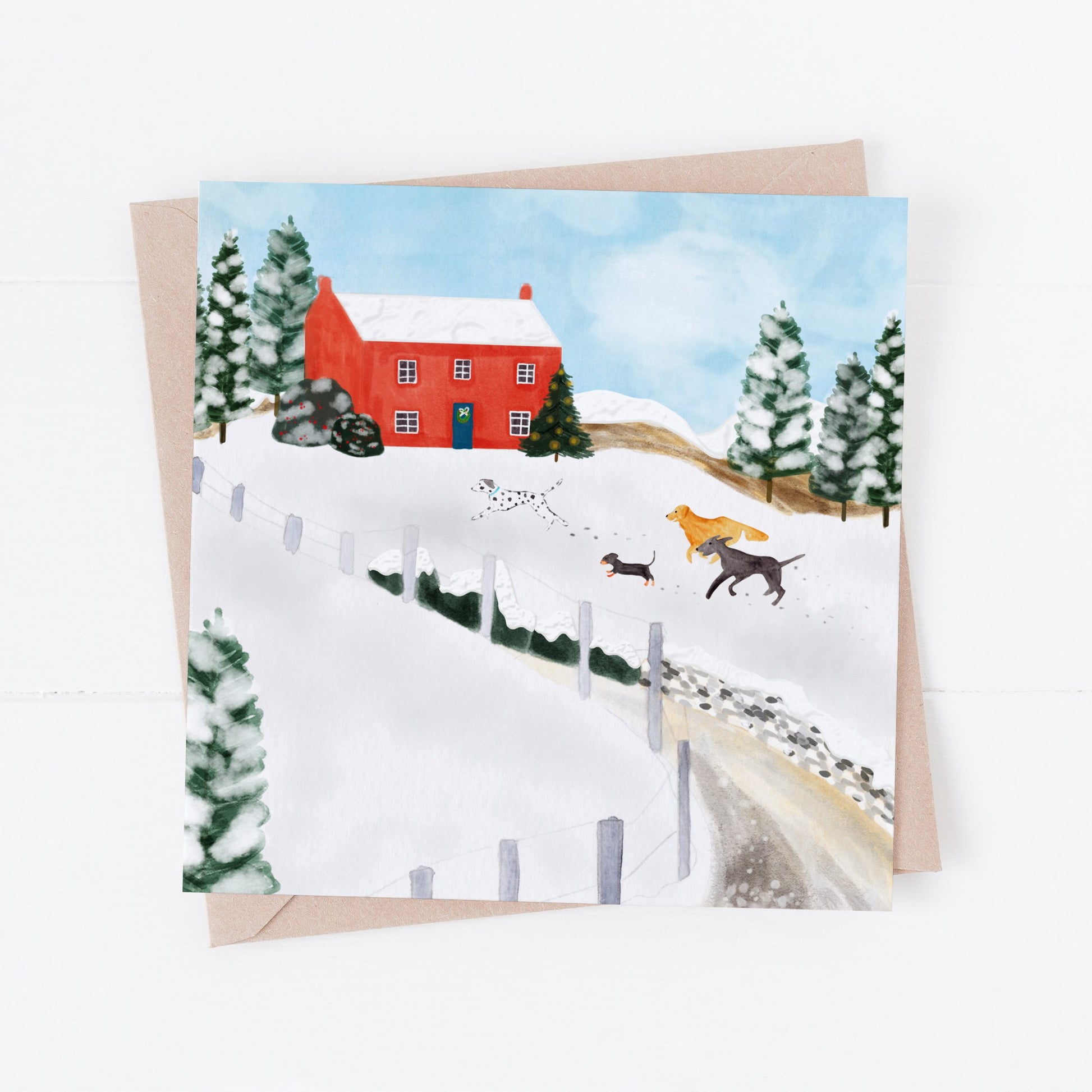 Capture the heartwarming joys of Christmas day with my enchanting "Dogs in the snow" Greeting Card. Featuring a Dalmatian, Dachshund, Golden Retriever and a Black Labrador frolicking in the snow in a winter wonderland .