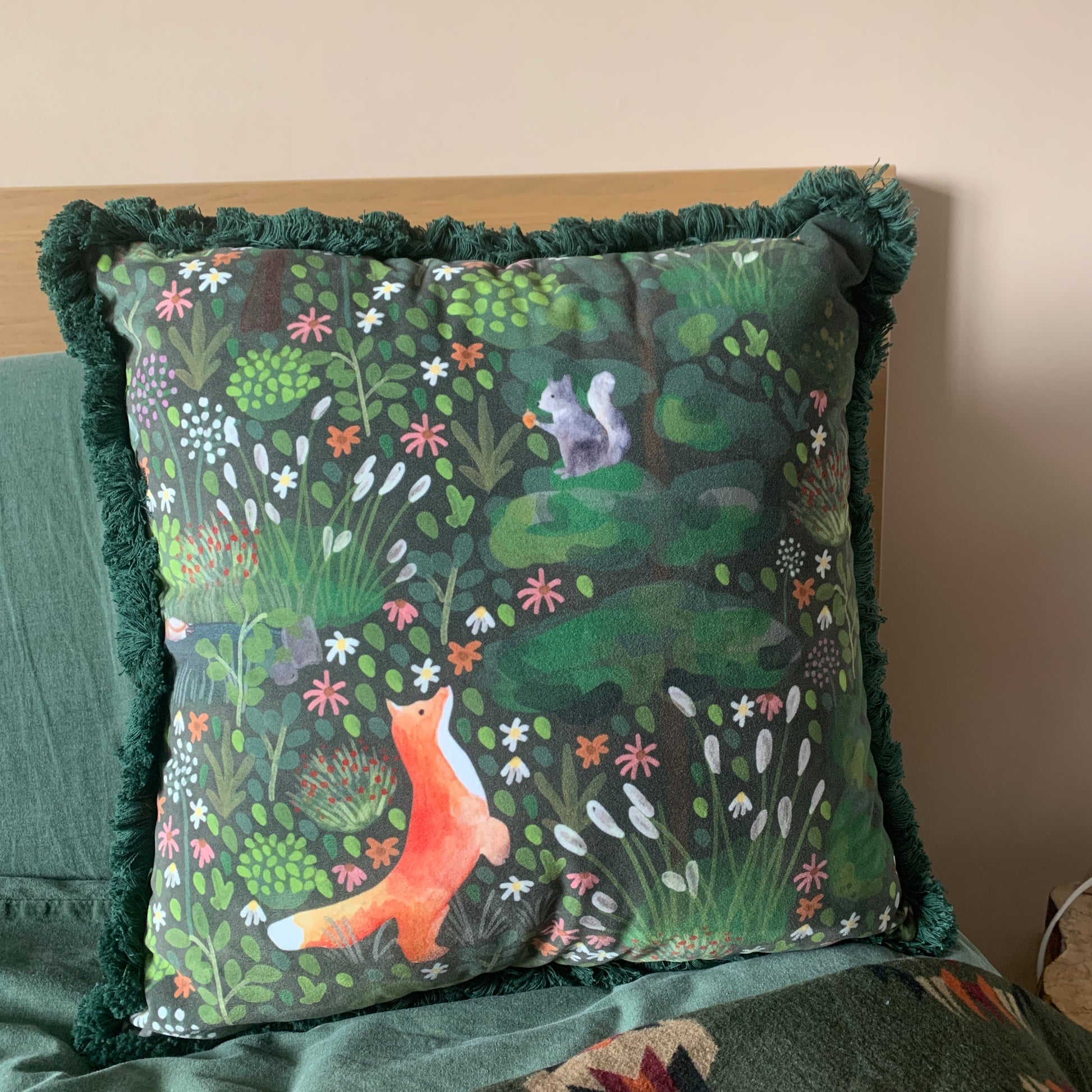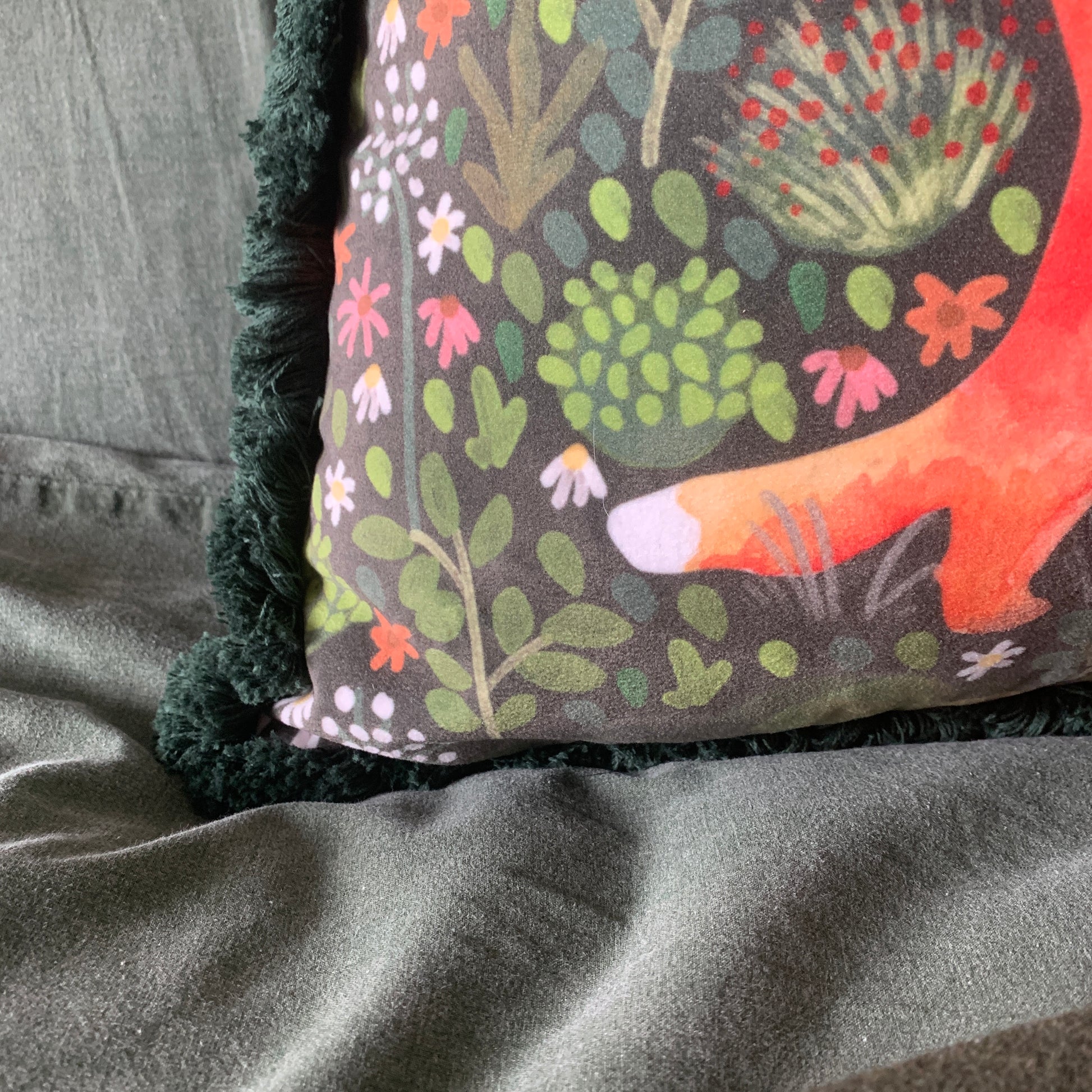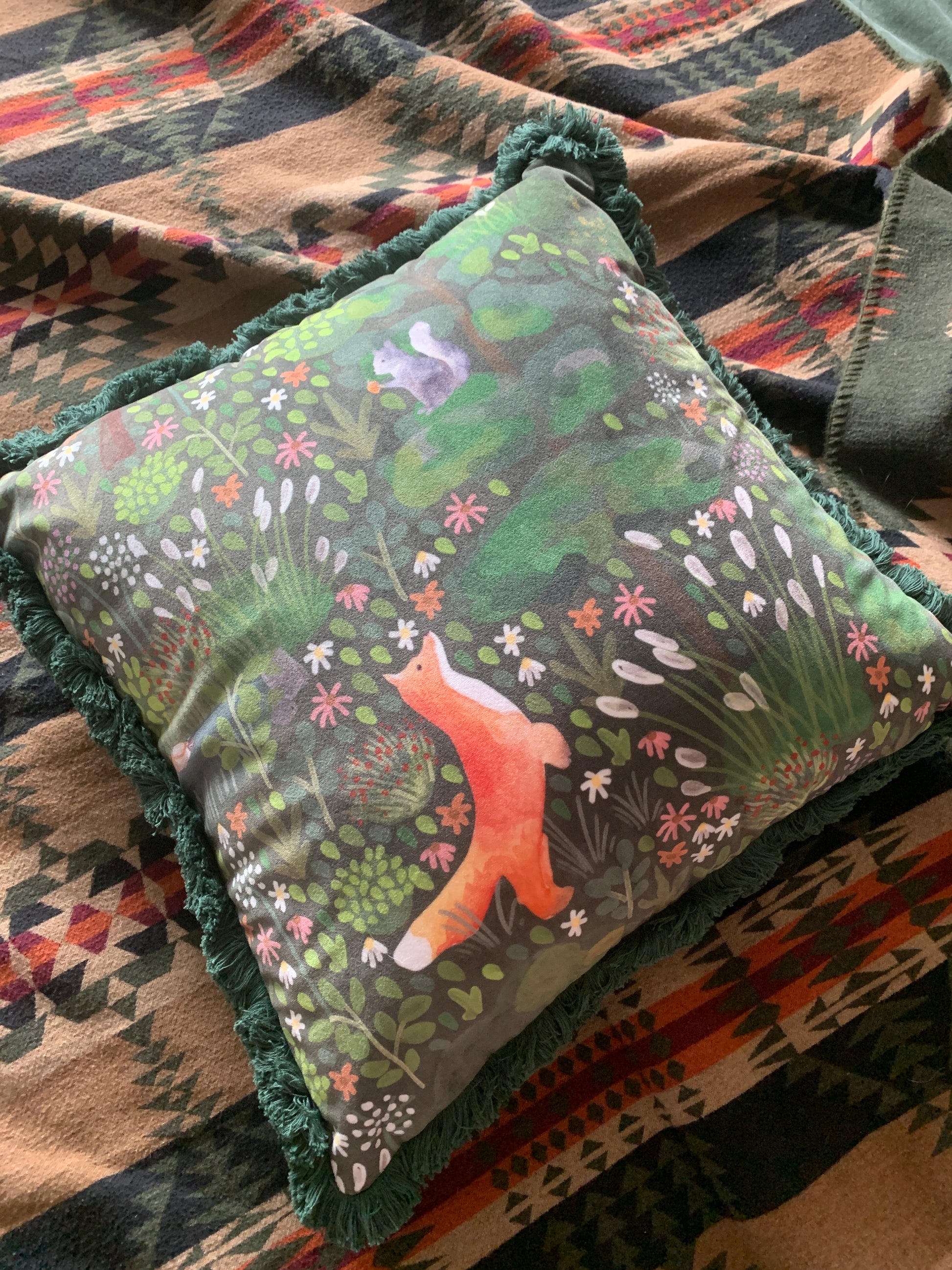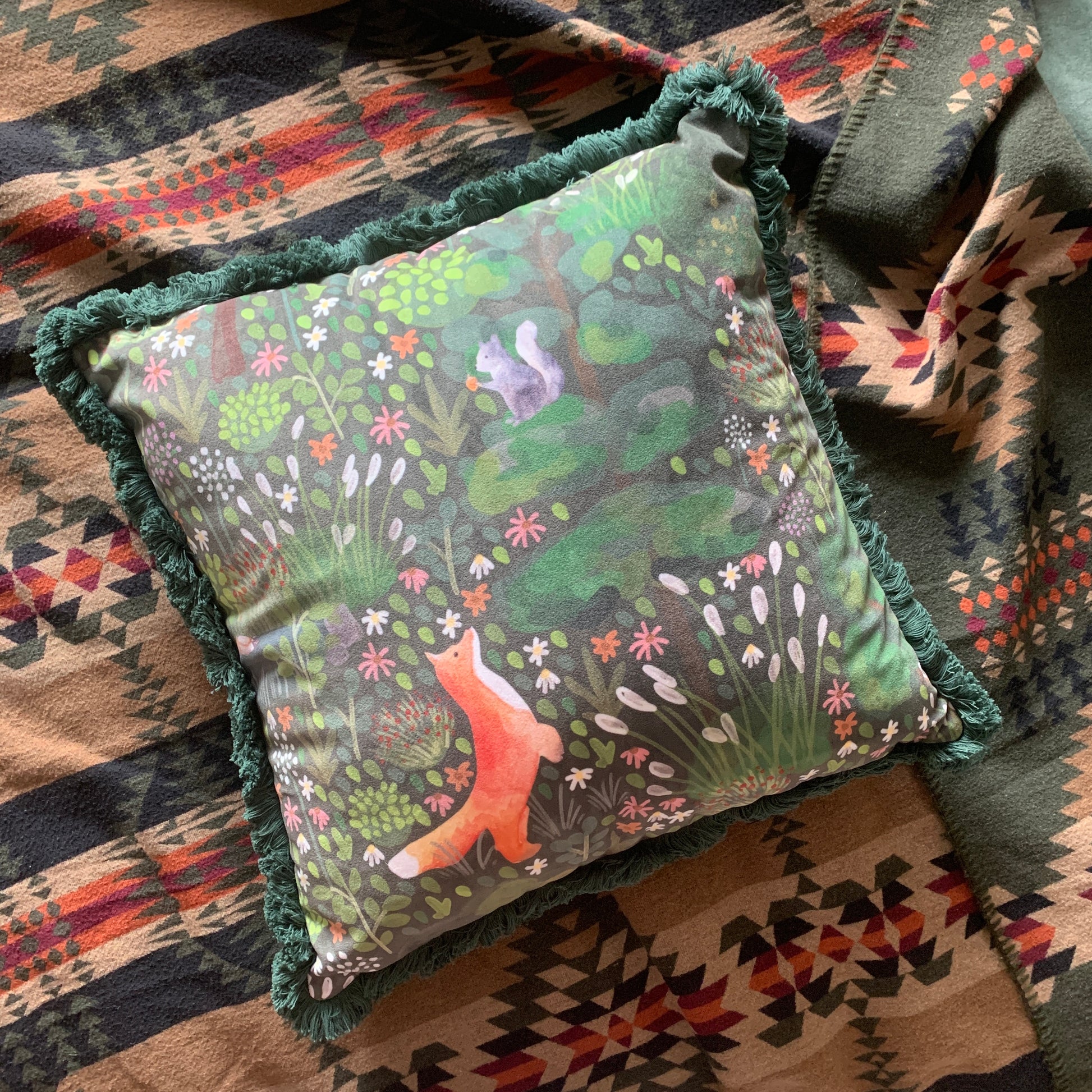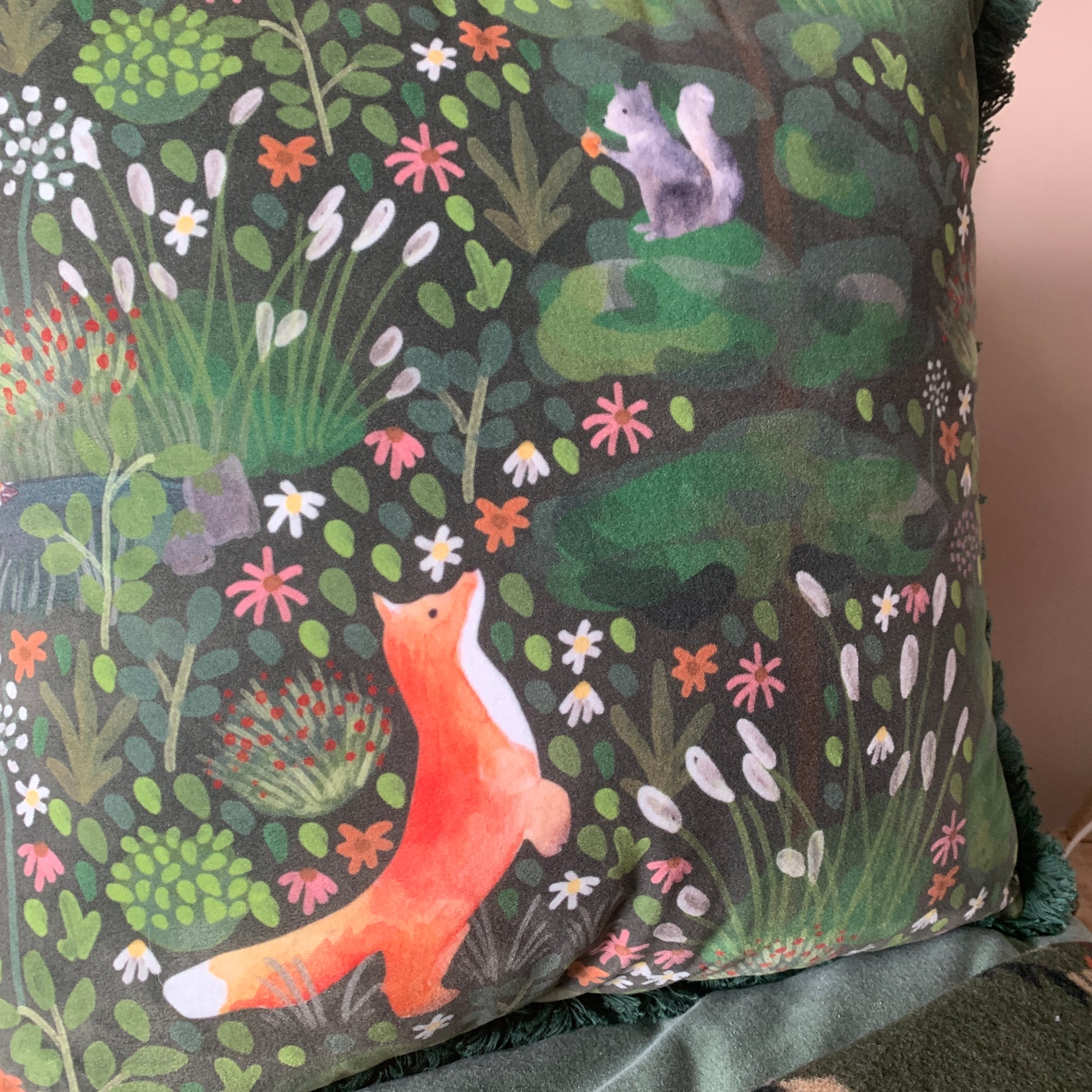 Introducing my luxurious velvet Fox pillow. Featuring a curious fox and a squirrel surrounded by summer flowers and leaves you will find in the forest. This cushion was inspired by my love for the wildlife you find in the forest. A great gift for someone who loves nature!