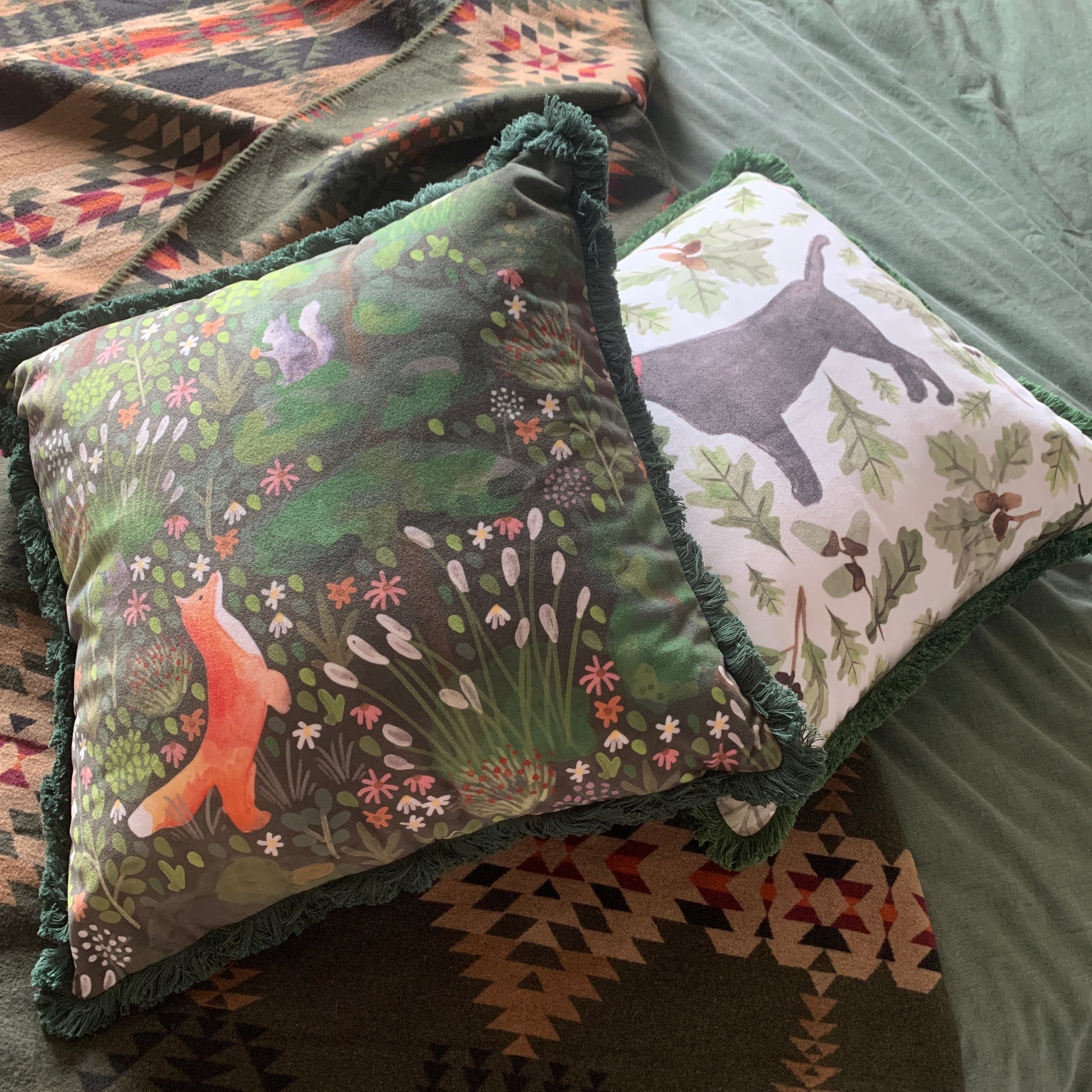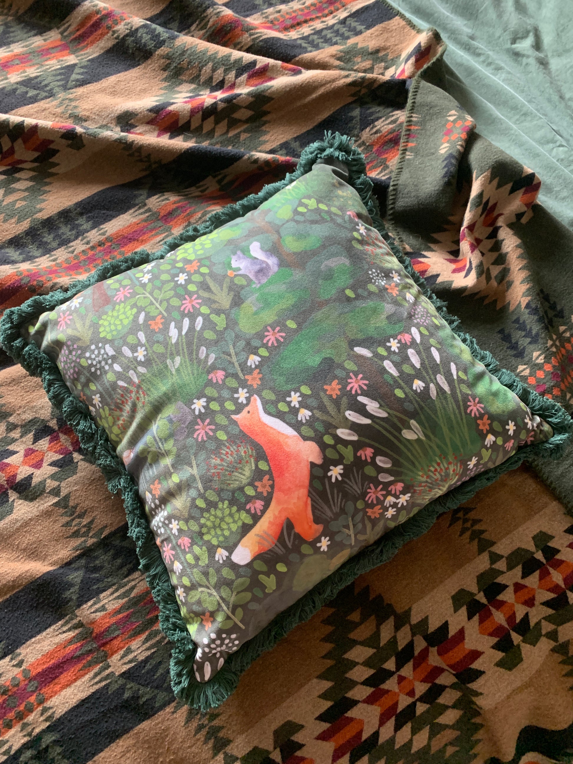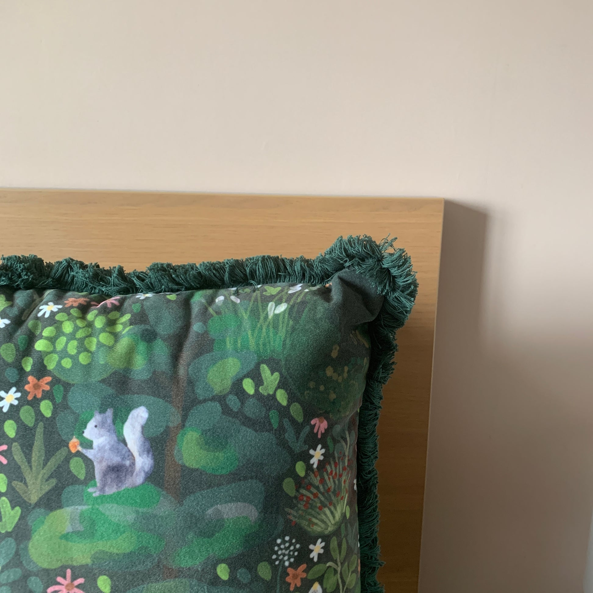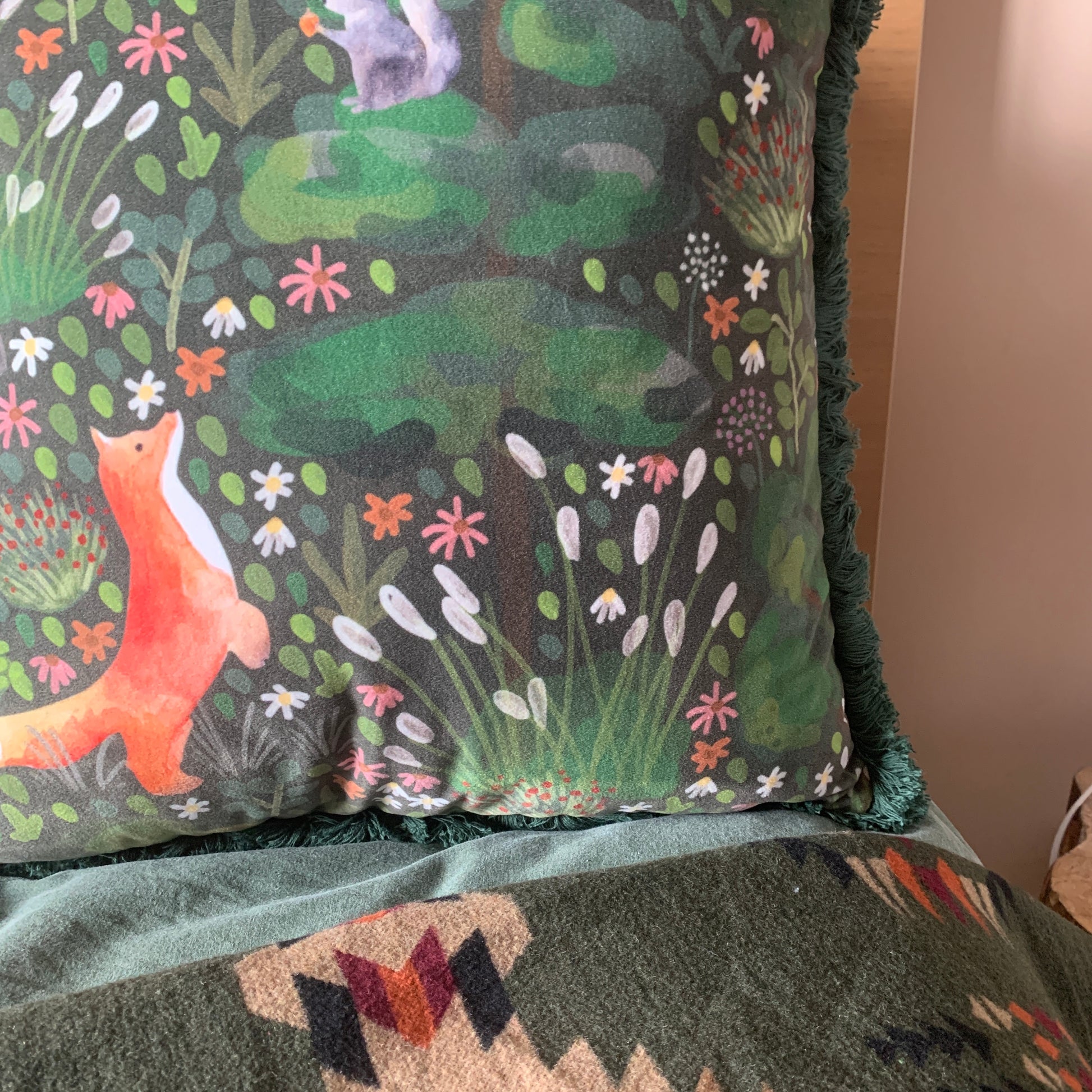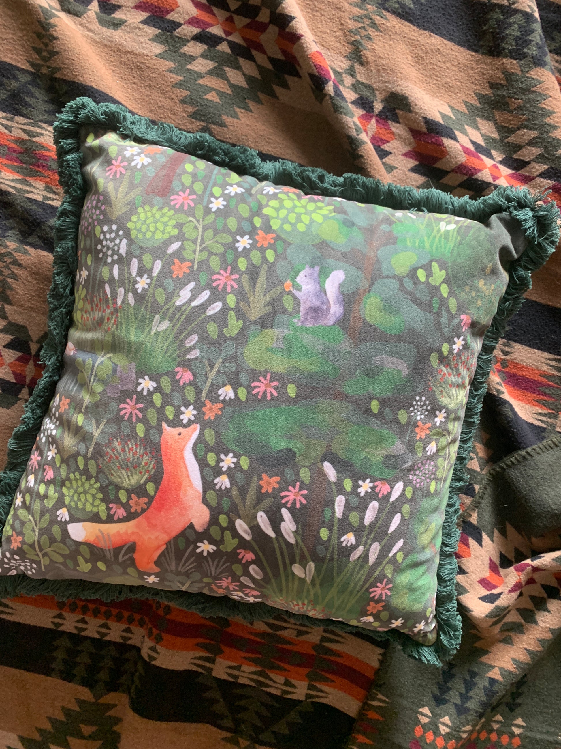 Introducing my luxurious velvet Fox pillow. Featuring a curious fox and a squirrel surrounded by summer flowers and leaves you will find in the forest. This cushion was inspired by my love for the wildlife you find in the forest. A great gift for someone who loves nature!