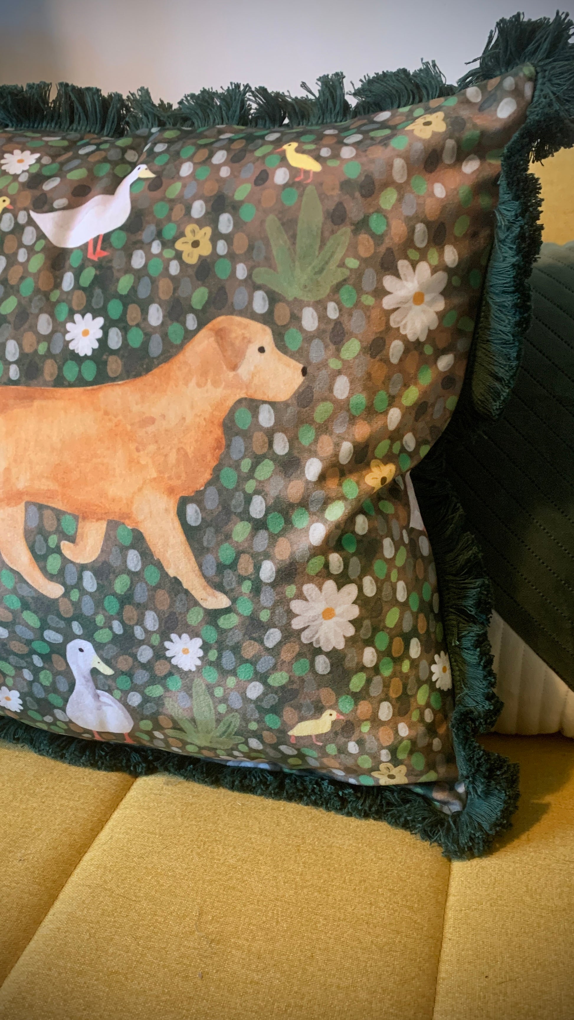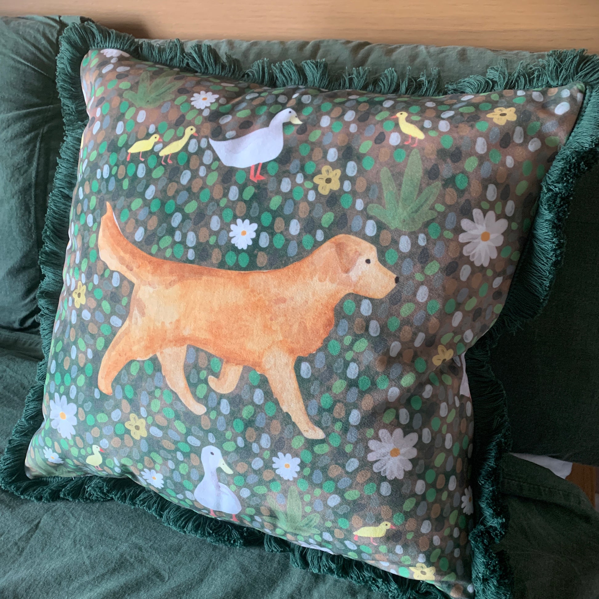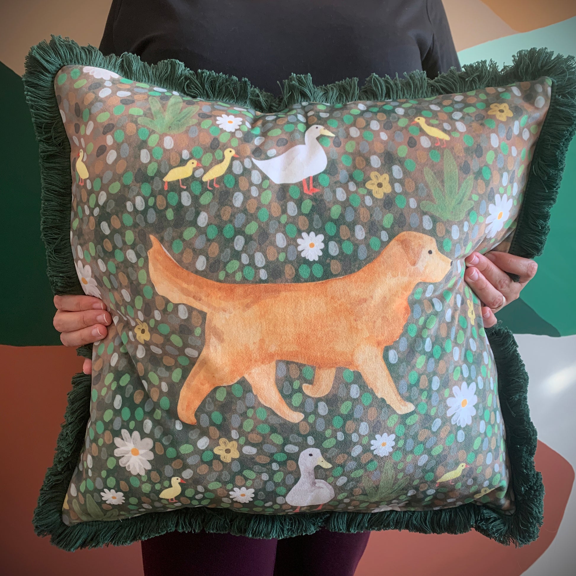 Introducing my luxurious velvet Golden Retriever cushion. This cushion was inspired by my love for the breed and new life in Spring. A great gift for someone who loves dogs!