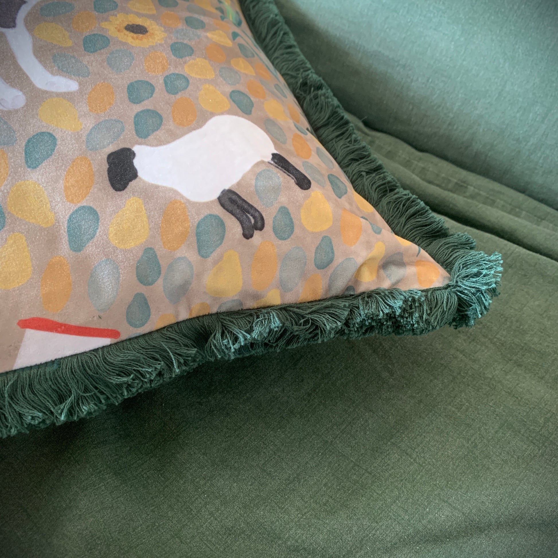 Cushion comes with a hidden zip, filler, green fringing and a luxurious green velvet back.