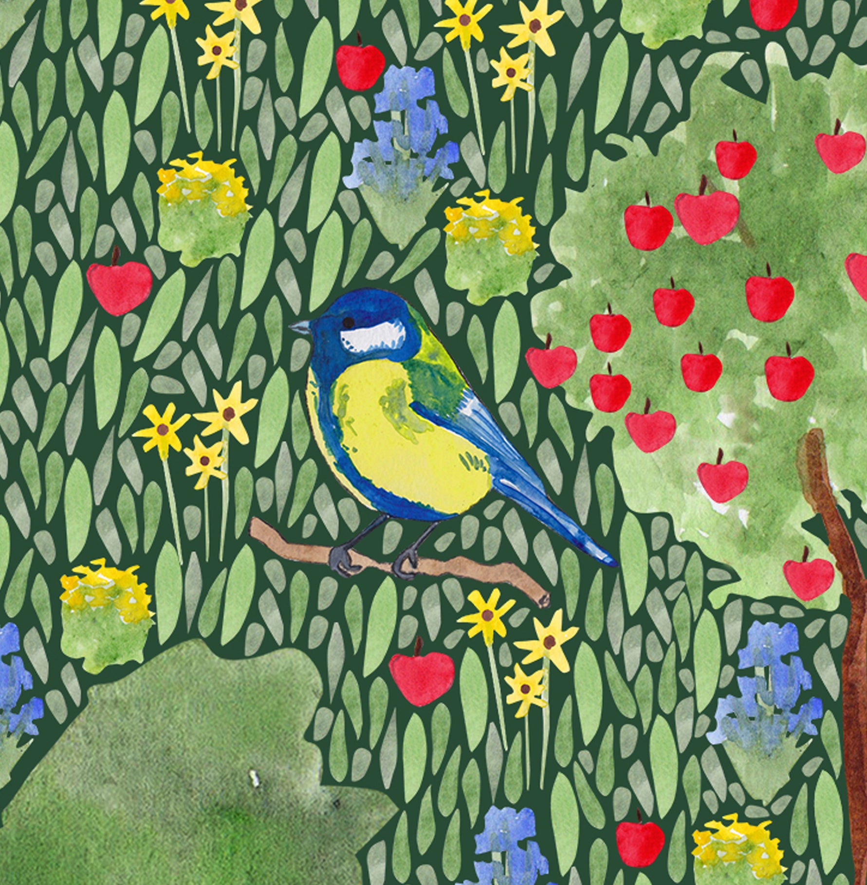 Introducing my Great tit greeting card. Featuring a Great tit surrounded by flowers and apple trees we may find in our back gardens. This card is perfect for giving to a loved one who loves birds and nature.