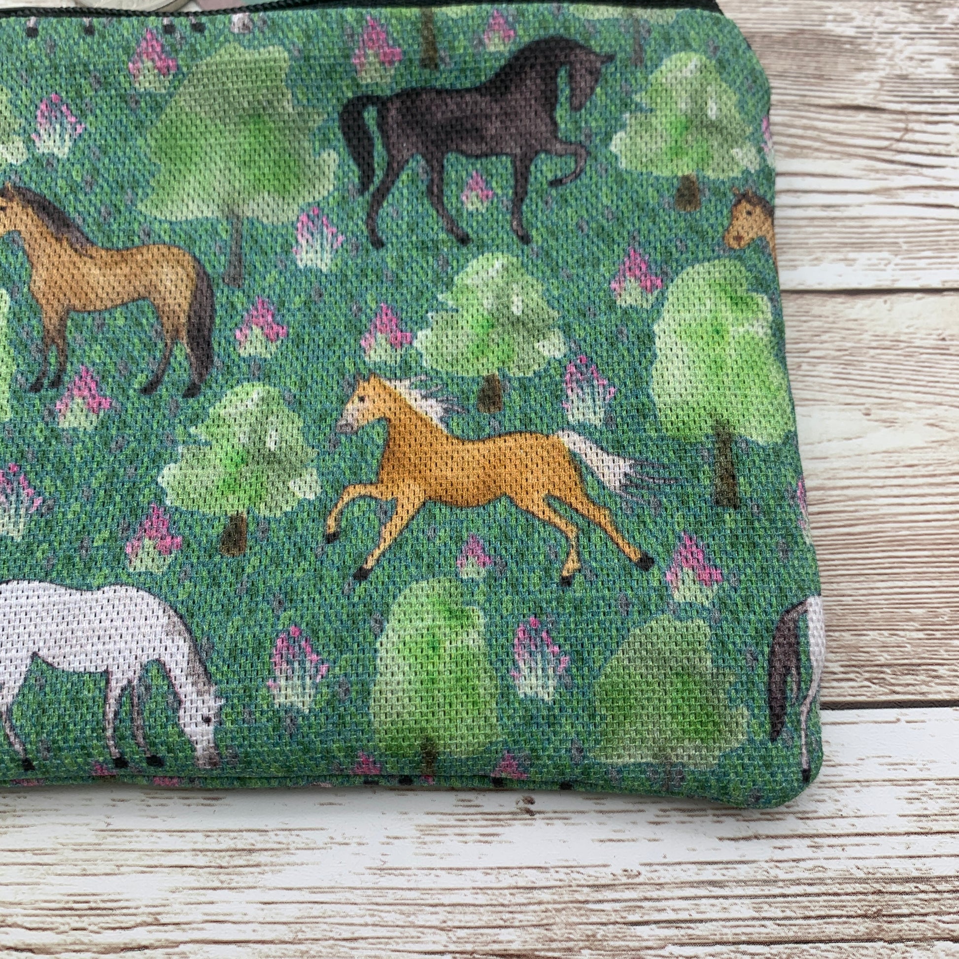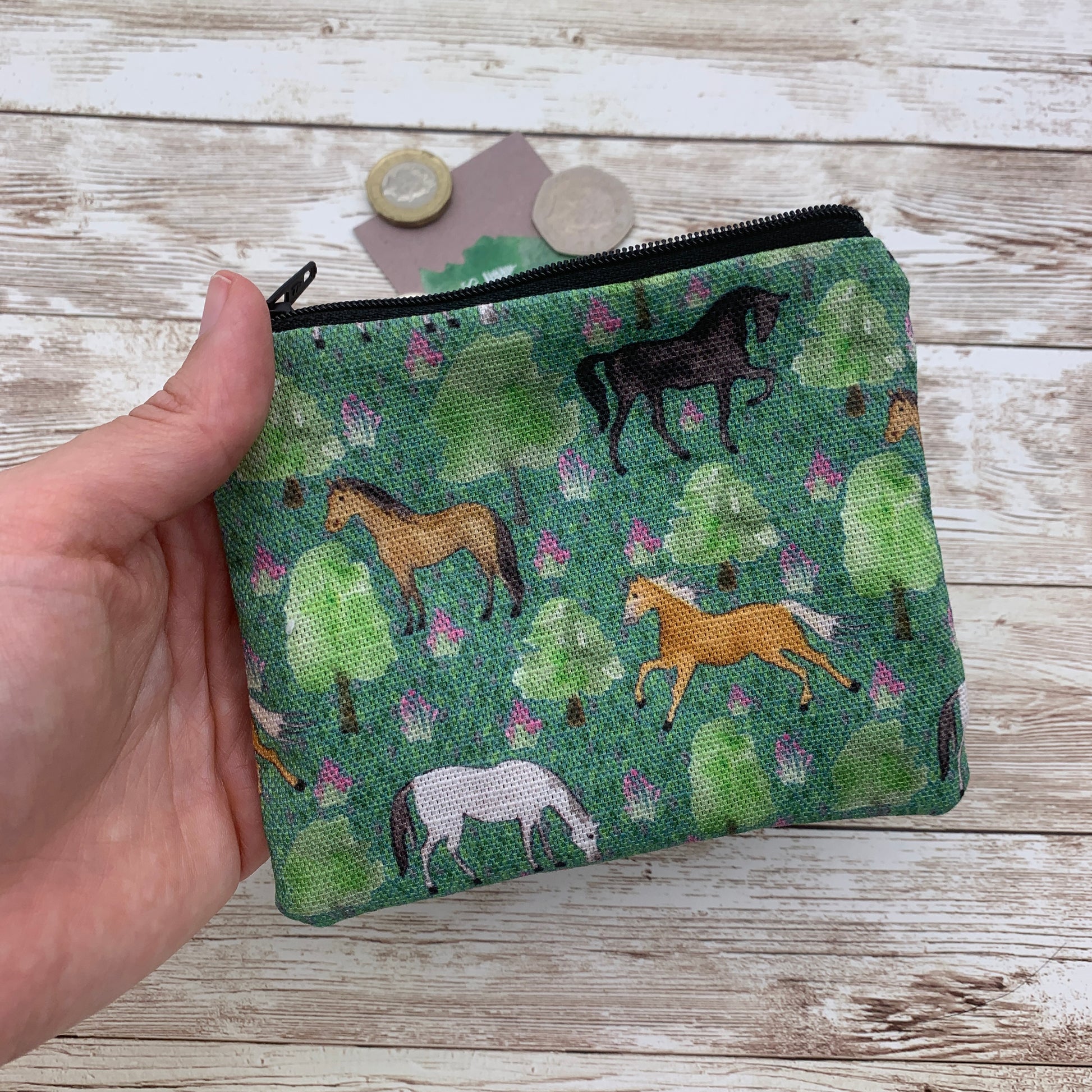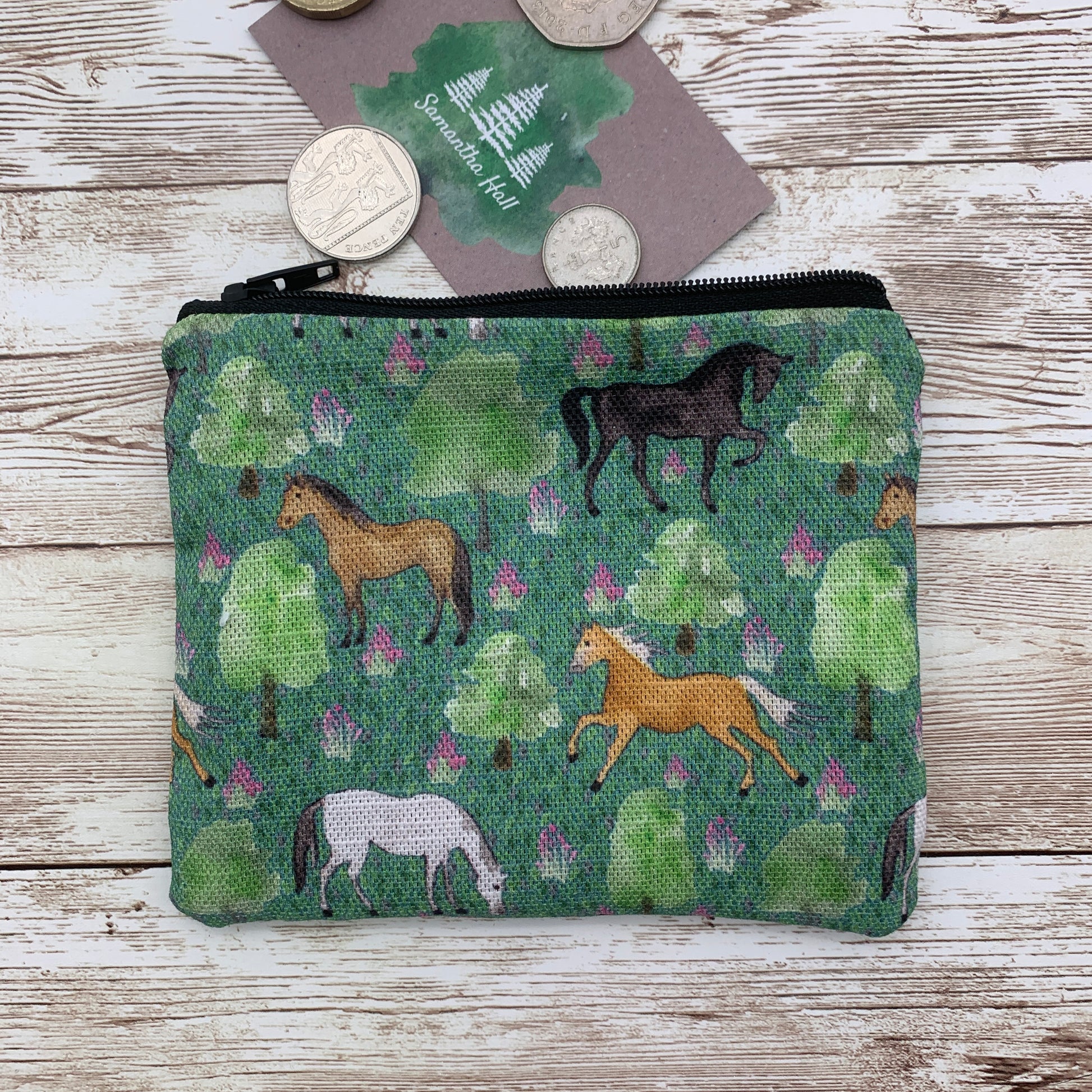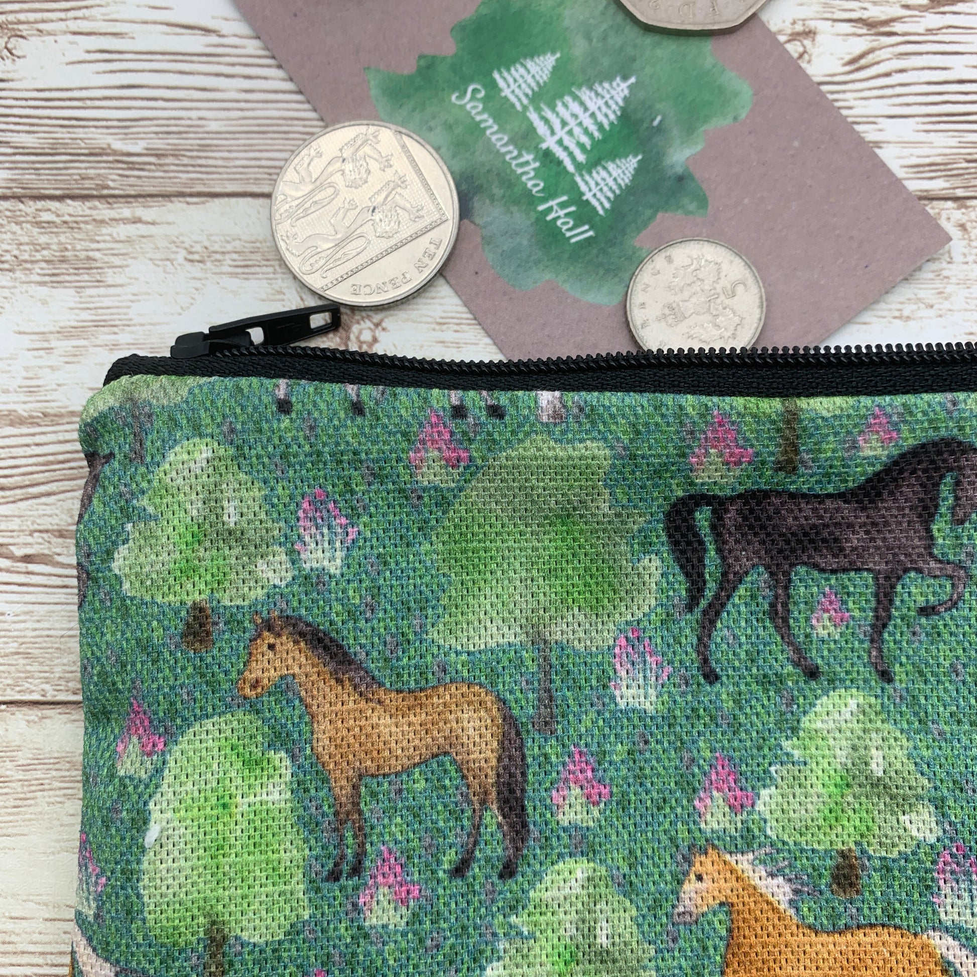 Introducing my Horse coin purse. Featuring hand painted watercolour black friesans, Mustangs, Andalusians and Haflinger Horses in cute poses surrounded by lavender and trees in the New Forest.